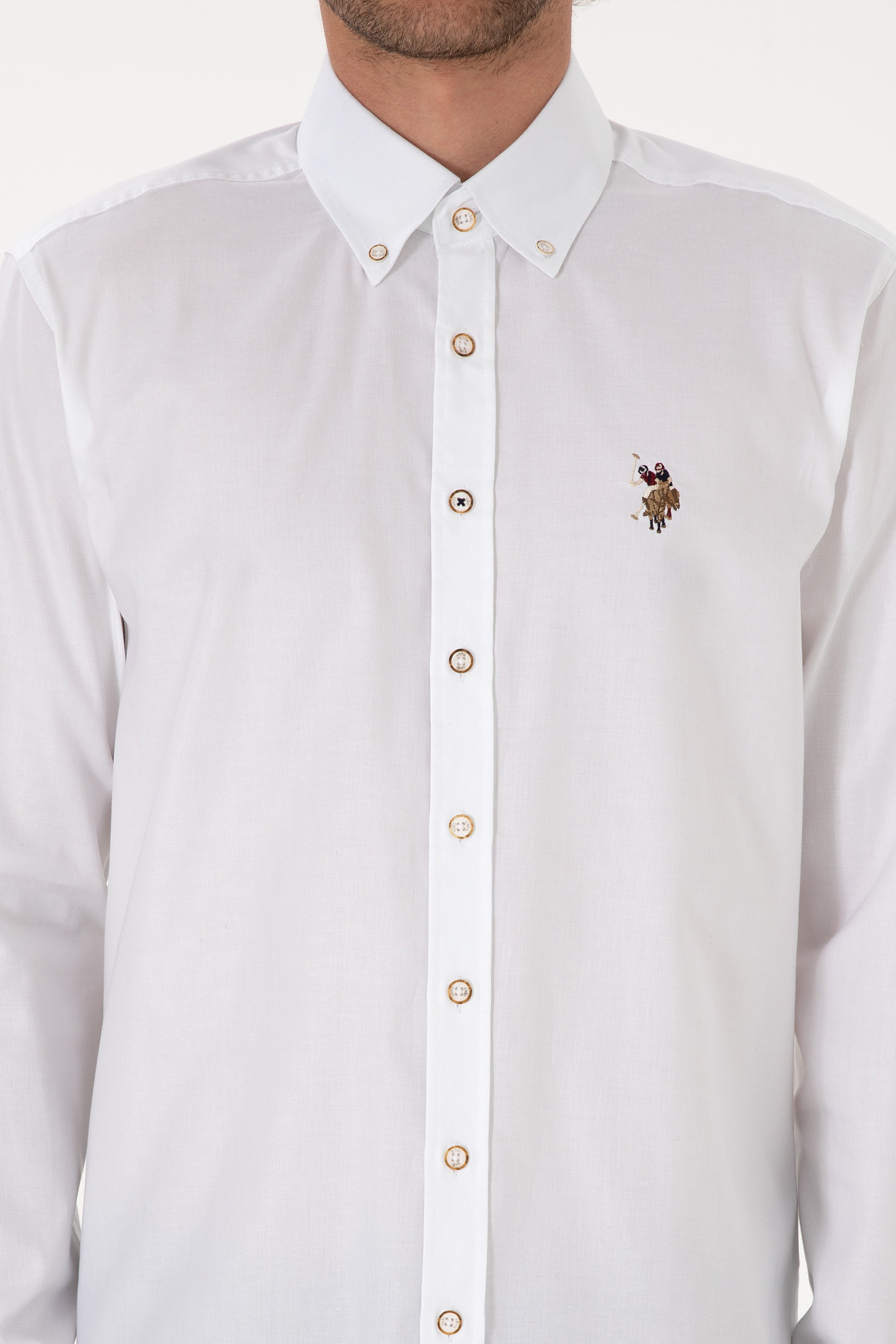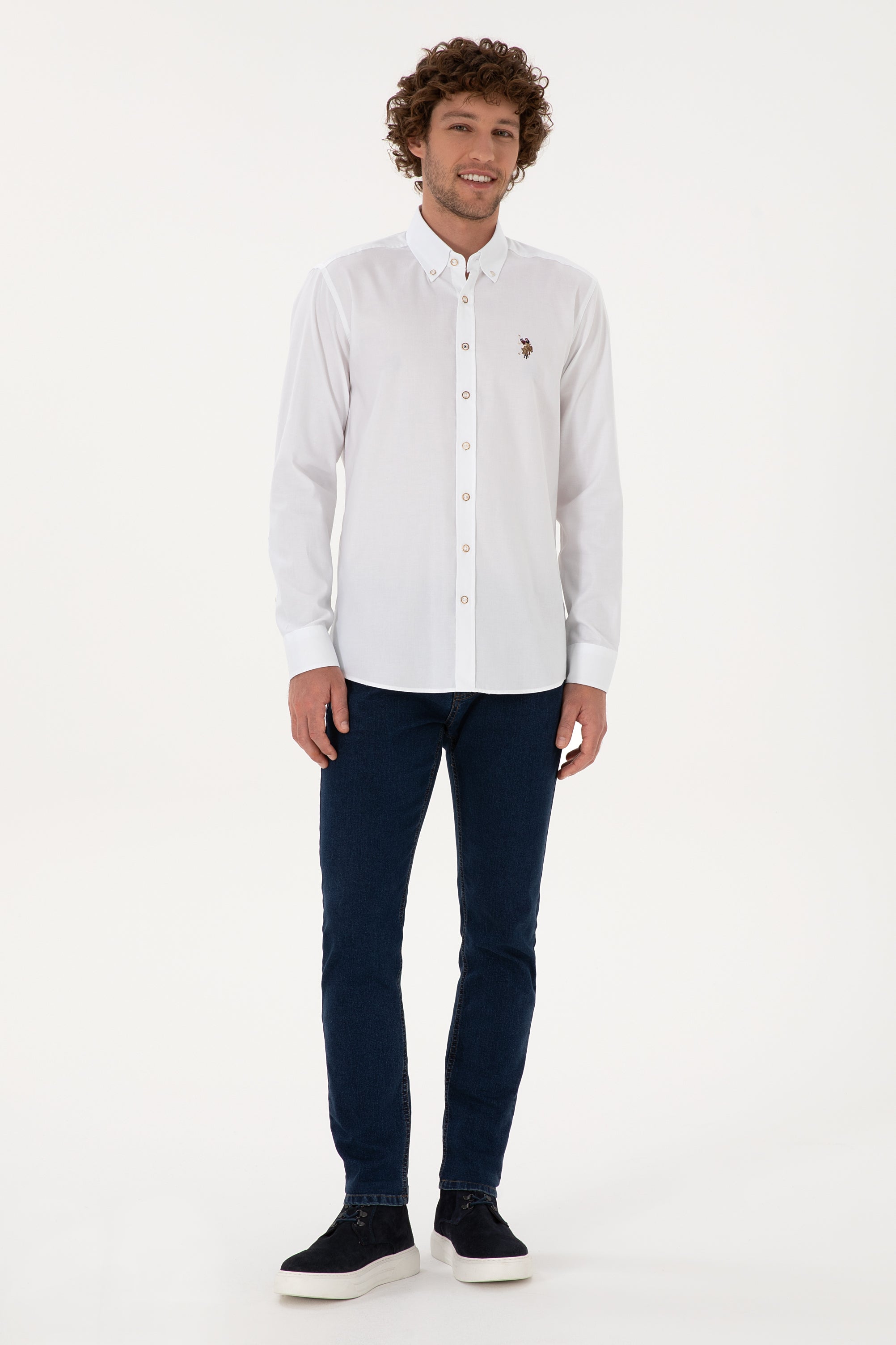 Këmishë klasike me mëngë të gjata dhe jakë me kopsë. Dizajni i pastër dhe elegant e bën të përshtatshme si për ambiente pune, ashtu edhe për kombinime të përditshme. E zbukuruar me logon klasike të qëndisur me ngjyrat tradicionale USPA në pjesën e përparme.